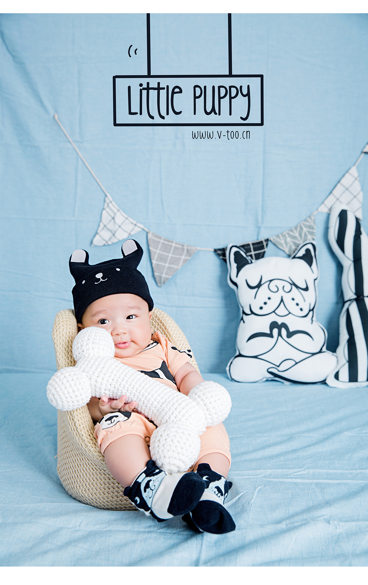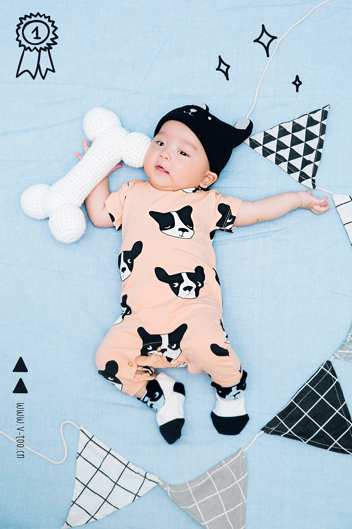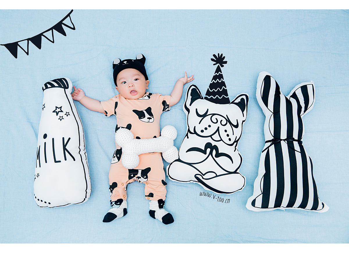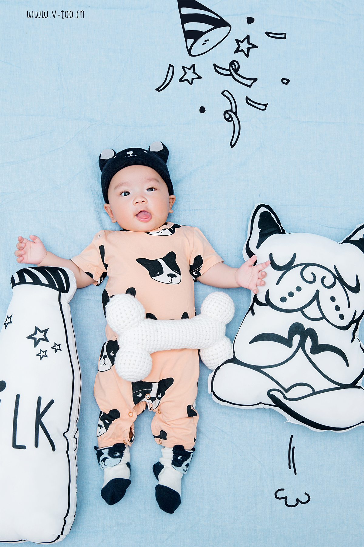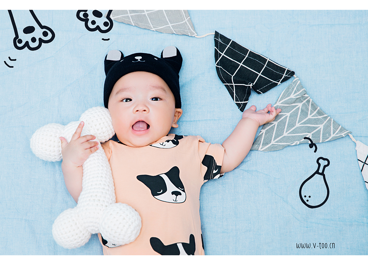 照片描述: 有一只幸福的小小狗找到了超大的磨牙骨头, 所以请来了小伙伴们开PARTY一起庆祝。 特点:狗年生肖百天宝宝,浅蓝橘柔和撞色增加活泼感。