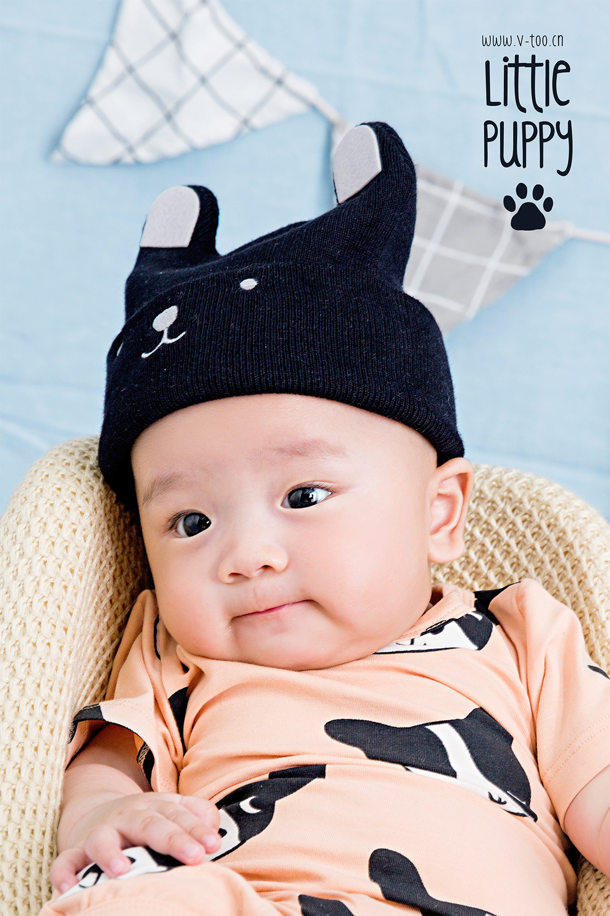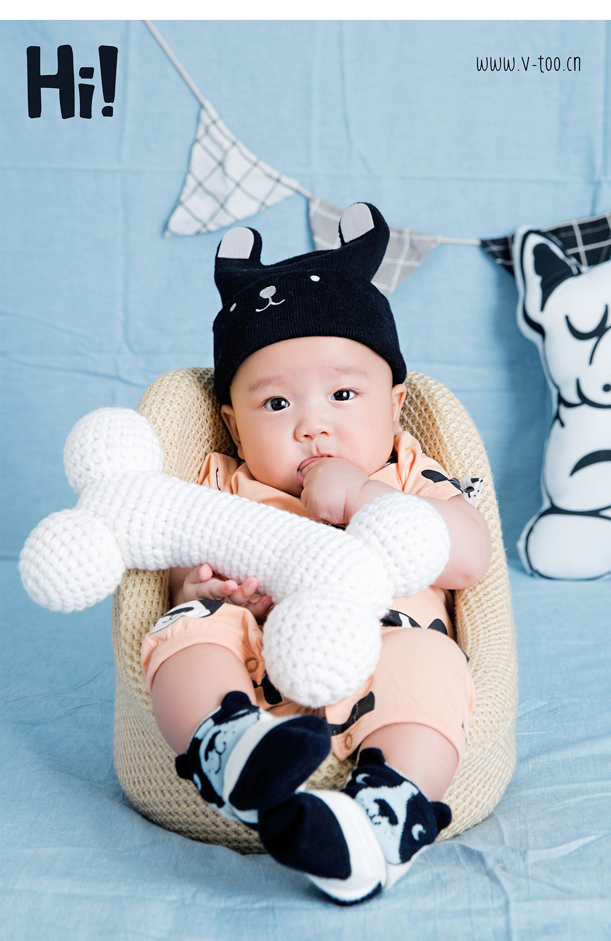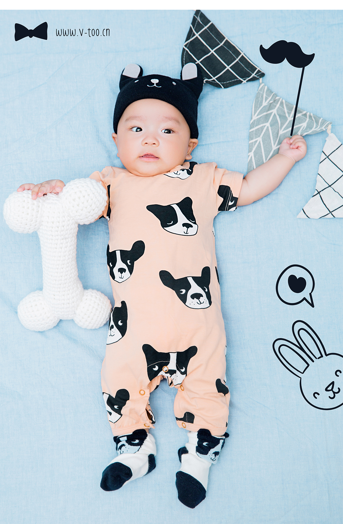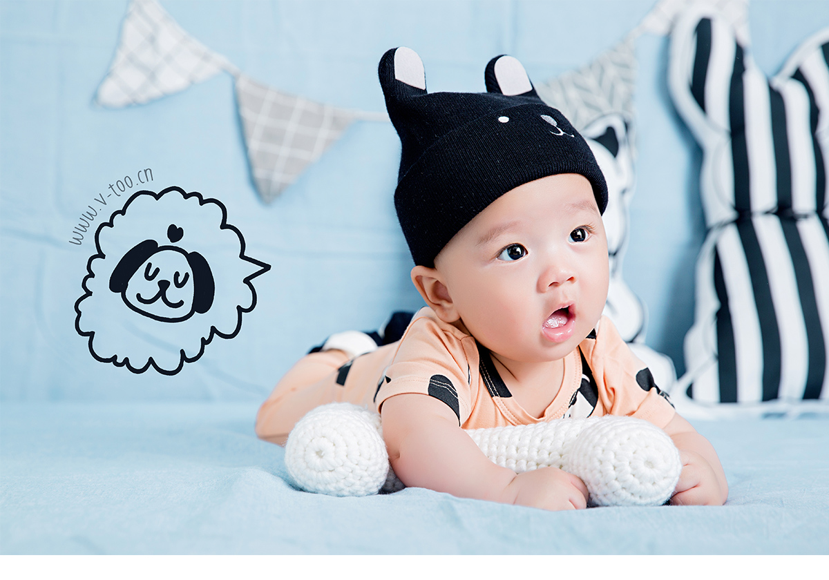 照片描述: 有一只幸福的小小狗找到了超大的磨牙骨头, 所以请来了小伙伴们开PARTY一起庆祝。 特点:狗年生肖百天宝宝,浅蓝橘柔和撞色增加活泼感。